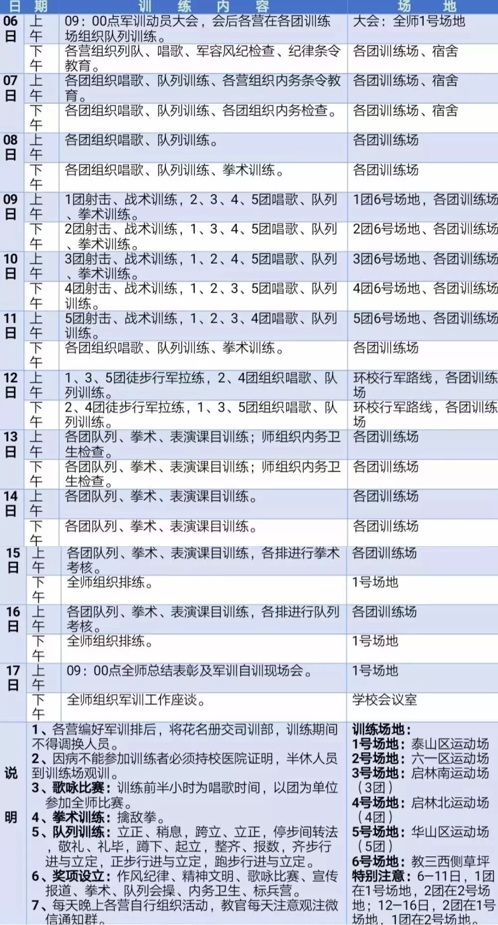 tips:6-11日(即军训的前六天)我院18级新生将于六一区运动场进行训练,12-16日(即军训的后五天)于泰山区运动场进行训练,其中12日将会进行徒步拉练,可以趁考试周的休息时间提前到六一区熟悉一下场地~