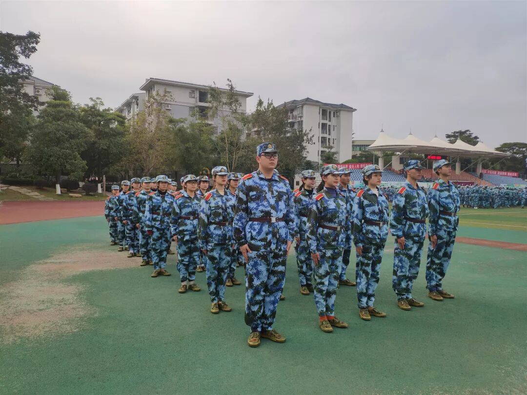 1月9日上午,广东外语外贸大学南国商学院2018级新生军训结营仪式在足球场举行。