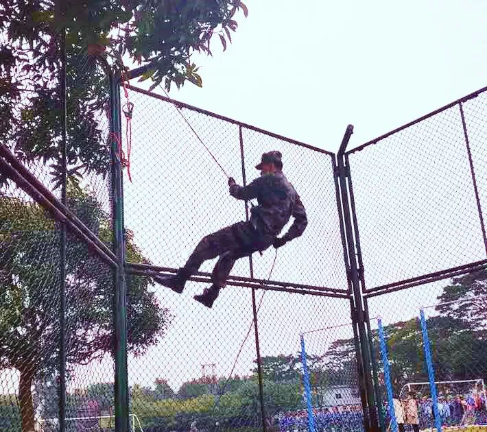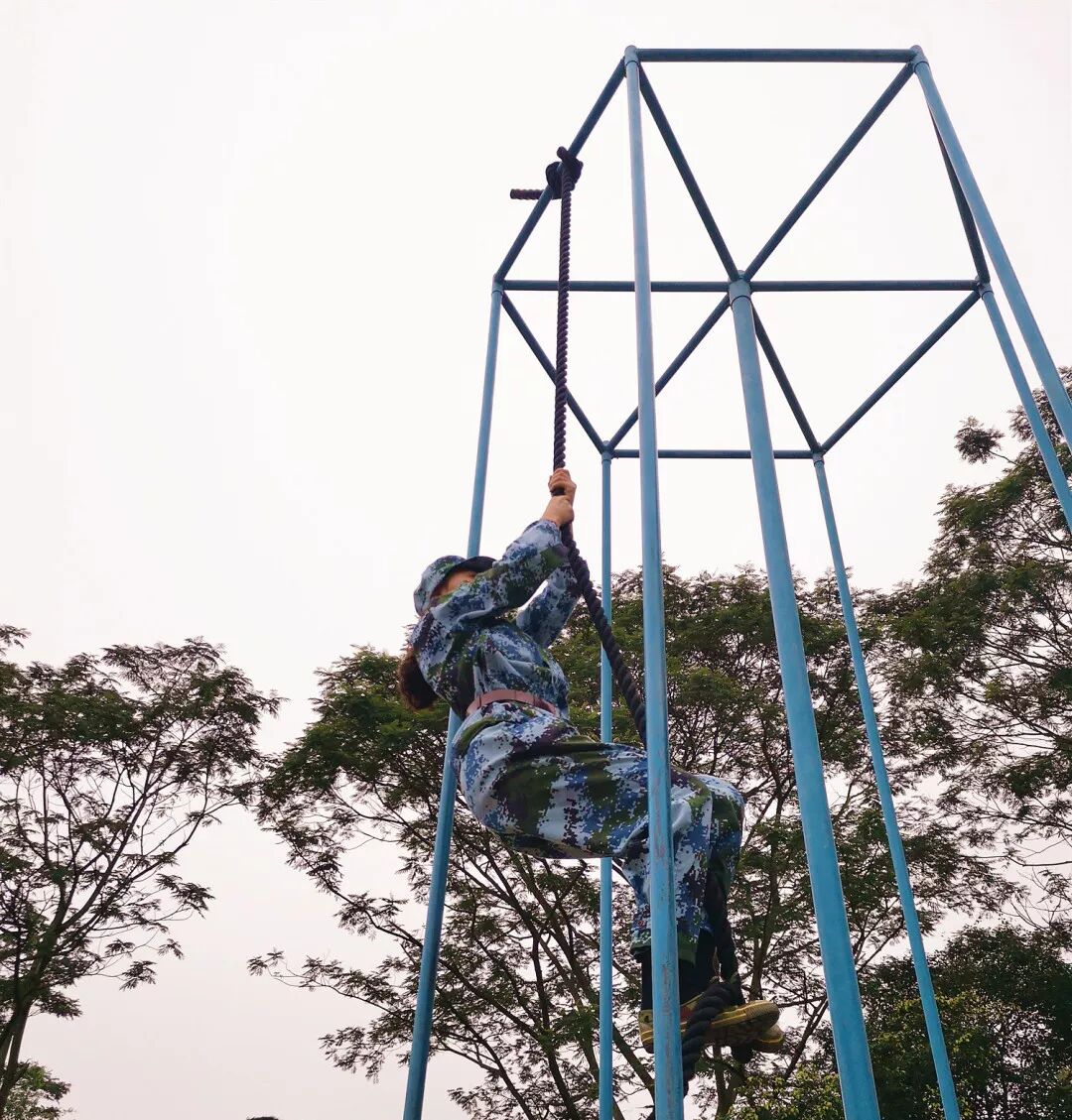 先锋连的同学们参与的积极性超高、学习能力强。稍加点拨,就已能成功地爬上绳子!