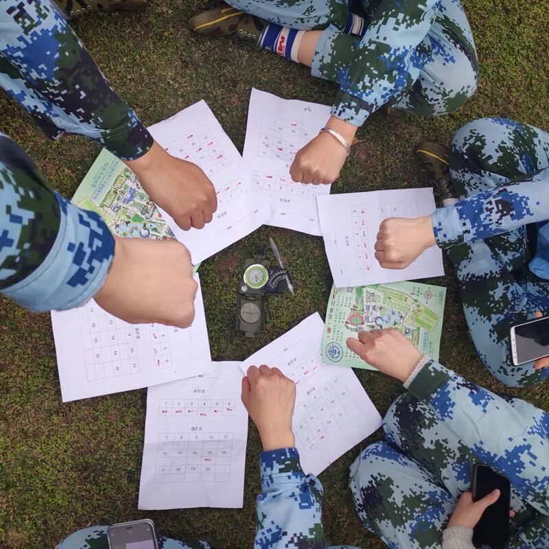 在这一个小时中,队员们用着手中的地图、指北针到达指定地点。每个小组都争分夺秒,一边出谋划策一边奋力奔跑。一个小时过去,各个小组陆续回来,每个人都大汗淋漓。六张纸、20个红印章,是团结的成果。