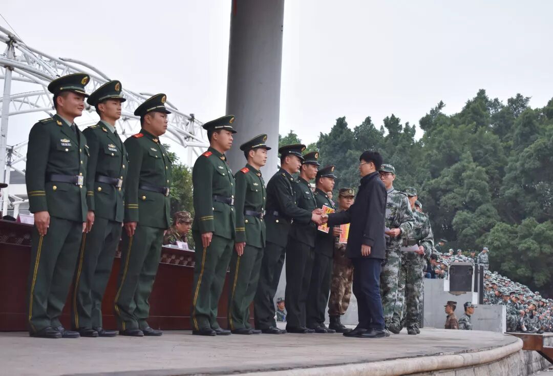 接下来分别由副校长罗廷荣、南宁政治部主任谢增来上校、广西军区警备纠察队中队长柳威上尉为先进集体及个人颁发荣誉奖状及证书、锦旗等。