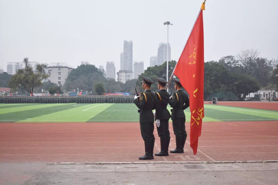分列式环节正式开始。分列式的成员是各营精英中的精英。此刻,他们在校旗的引导下,踏着坚定的步伐,喊着嘹亮的口号,组成整齐的方阵,昂首挺胸,阔步前行,接受检阅。