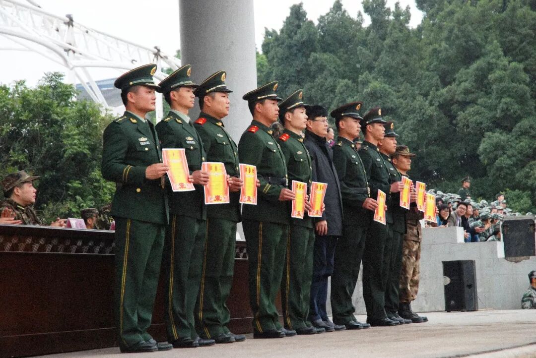 广西武警总队南宁支队政治部主任谢增来上校,广西军区警备纠察队中队长柳威上尉为获奖教官颁发证书。