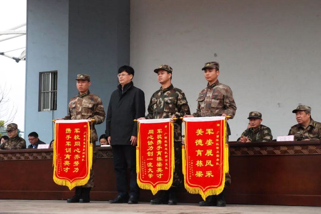 罗廷荣副校长为承训部队赠送锦旗,向大力支持我校军训工作的广西军区战备建设局、广西武警南宁总队南宁支队和全体教官们表示衷心的感谢。