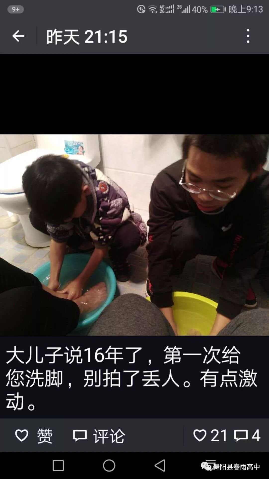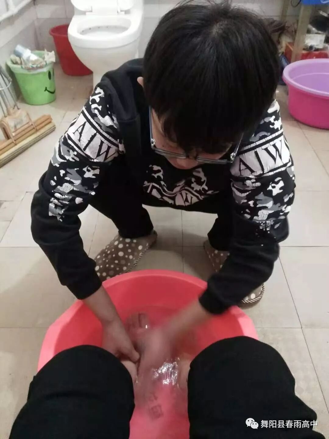 学生通过传统文化学习回到家里给父母洗脚